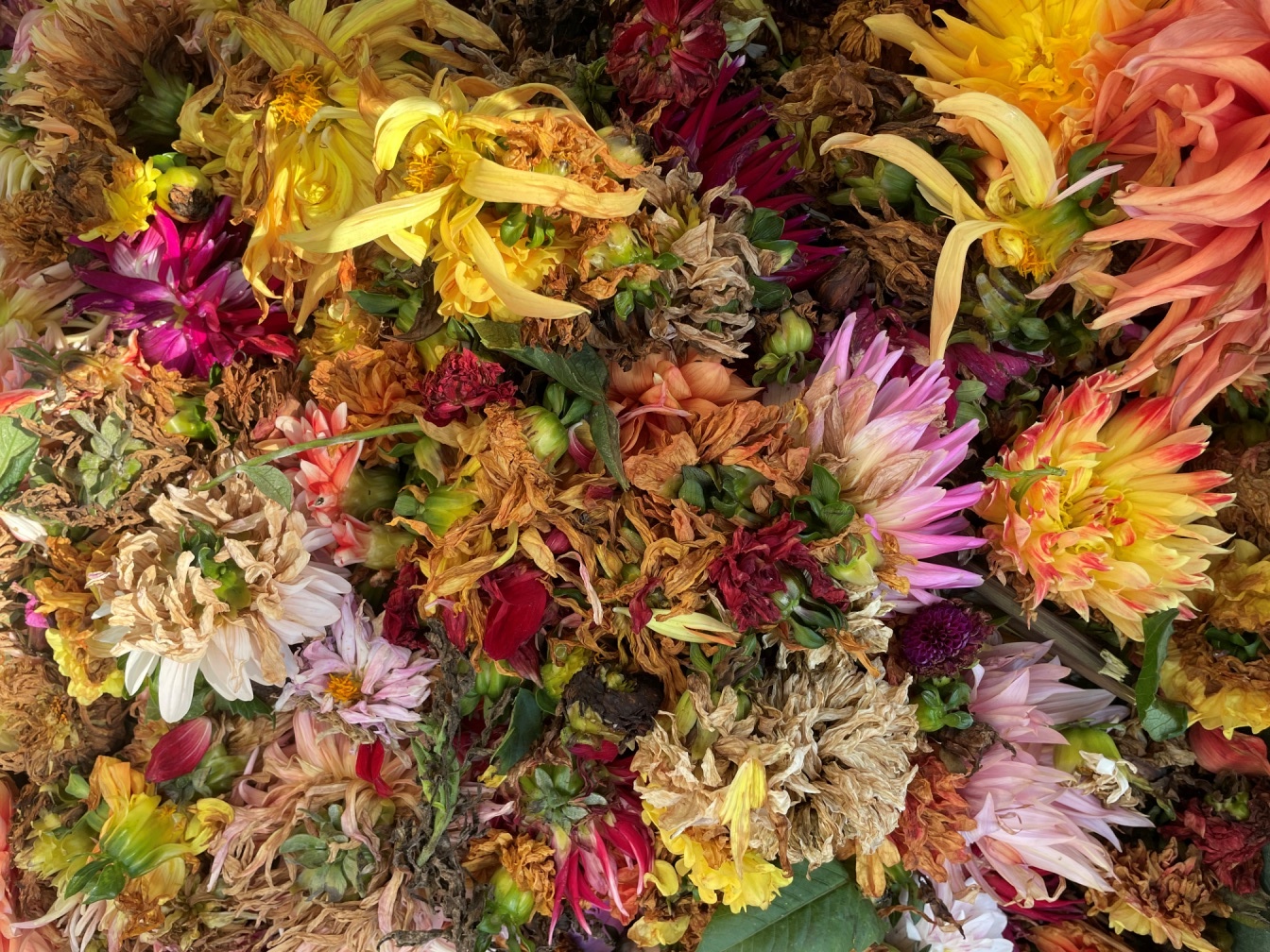 Hoe anders is het rondom het huis. Hier werden de bloemen enthousiast verwelkomd en nooit gemaaid. Sinds de droogte voorbij is bloeit alles volop. Schoffelen hoeft niet meer omdat de dahlia’s het onkruid verdrongen hebben. Maar toch blijft het druk. Af en toe wordt er een boeketje geplukt voor de vaas. Maar we genieten veruit het meeste van de dahlia’s die buiten staan. Om de tuin fris te houden worden alle uitgebloeide bloemen geregeld verwijderd. Hierbij let ik vooral op de onderkant van de bloemen. Als daar bruine blaadjes verschijnen vind ik het tijd om er afscheid van te nemen. Het is een werk waar geen einde aan komt. Iedere dag zijn er wel weer een aantal bloemen die hun schoonheid verloren hebben. Je kunt de bloemen netjes met het steeltje erbij afknippen. Als het er te veel zijn is het ook mogelijk om de bloemen met de hand van de steeltjes te trekken. Het geeft niet zo’n mooi resultaat maar is wel net zo effectief om weer veel nieuwe knoppen te krijgen.